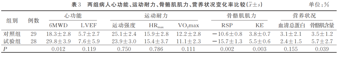 2.3两组病人心功能、运动耐力、骨骼肌肌力、营养状况变化率比较变化率为干预前后差值与干预前数值之比,两组病人心功能、运动耐力、骨骼肌肌力、营养状况变化率比较见表3。