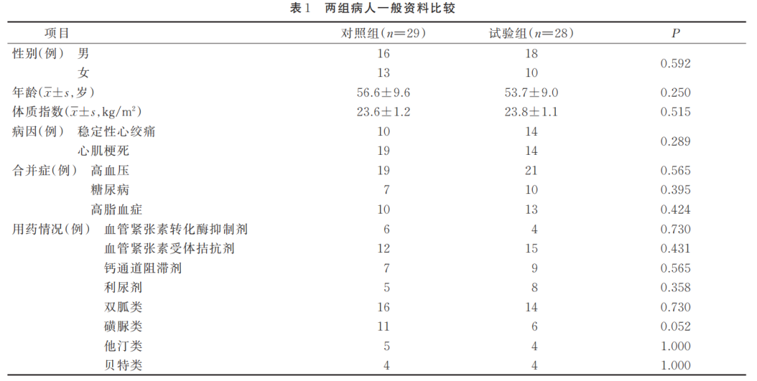 2.1两组病人一般资料比较 康复期间,试验组和对照组均有1例病人因非心血管疾病原因中断治疗4周以上被剔除,试验组有1例病人因移居外市终止治疗剔除。最终对照组29例完成研究,试验组28例完成研究。两组性别、年龄、体质指数(BMI)、病因、合并症、用药情况比较,差异均无统计学意义(P>0.05)。见表1。