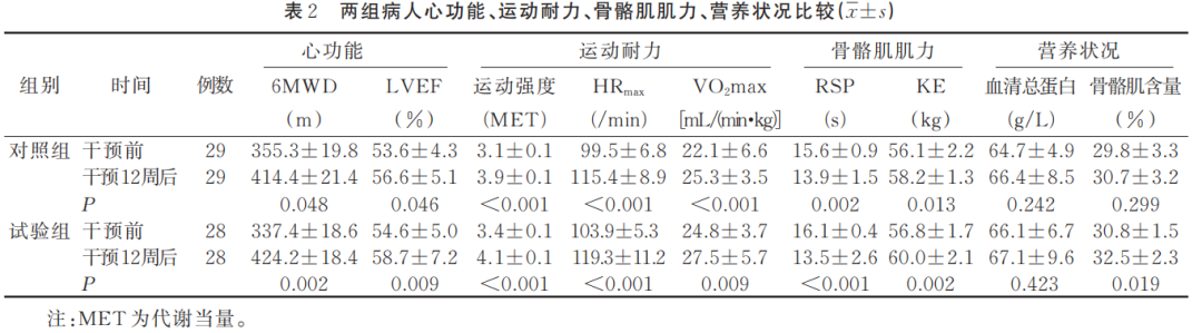 2.2两组病人心功能、运动耐力、骨骼肌肌力、营养状况比较(见表2)