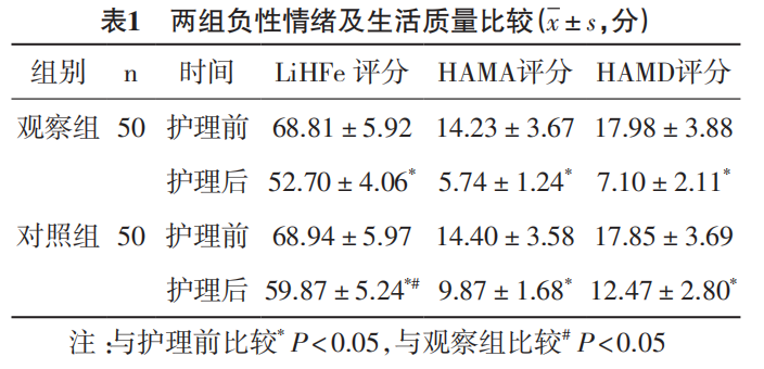 两组护理后LiHFe评分、HAMA评分、HAMD评分均较护理前显著降低,且干预后观察组显著低于对照组(P<0.05),见表 1。