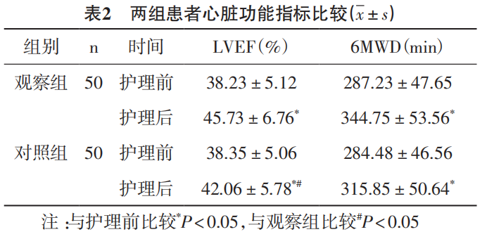 两组护理后LVEF、6MWD均较护理前显著升高,且护理后观察组显著高于对照组(P<0.05),见表 2。
