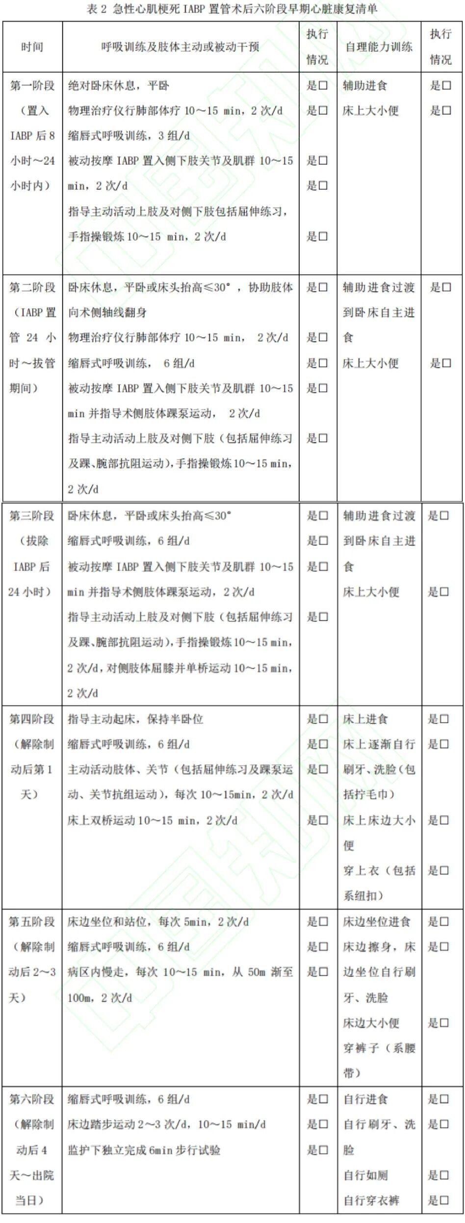 1.2.1.1制订清单由心脏康复研究小组(成员包括心内科医生2人,专科康复治疗师3人,心内科监护室护士6人及心脏康复护士1人;其中心内科监护室护士长为组长,心脏康复护士为副组长)参考2022年《心脏康复护理专家共识》,根据IABP置管后不同时间阶段并结合患者病情制作六阶段心脏康复管理清单,并负责监督康复清单的落实。围绕呼吸训练、肢体主动或被动干预、自理能力训练三个维度展开,结合患者病情开展相关阶段的训练,由最初的被动运动逐步过渡到主动运动,帮助患者由平卧过渡床边座位休息,进而原地踏步训练和病区行走。(见表2)。