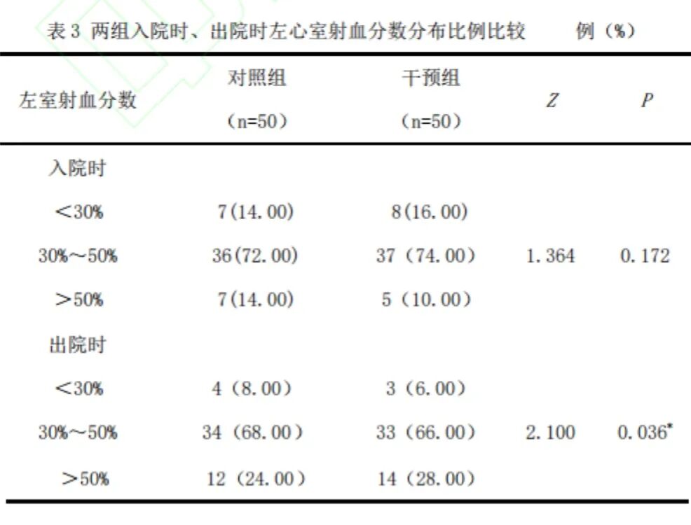 出院时两组患者左心室射血分数较入院时均提升,结合患者左心室射血分数<30%、30%~50%、>50%三个等级,干预组整体高于对照组,差异有统计学意义(P<0.05),见表3。