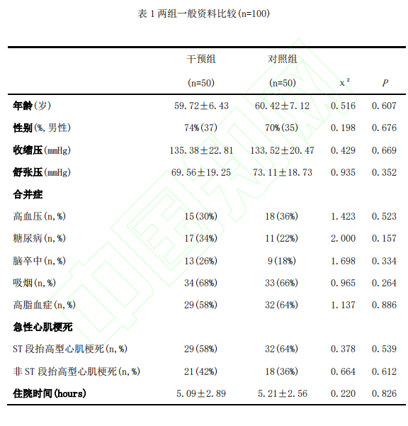 2022年1月至2022年11月在我院急性心肌梗死主动脉球囊反搏治疗患者为研究对象。纳入标准:①意识清楚,沟通无障碍;②确诊急性心肌梗死并接受经股动脉行IABP辅助循环;③患者IABP置入后8h内没有新发或再发胸痛以及心律失常或心电图动态改变、没有新的心功能失代偿表现(静息时呼吸困难伴湿罗音);④生命体征平稳,血肌钙蛋白水平基本保持稳定或下降、NTproBNP阈值水平<1538ng>120次/min);③不能或不愿配合研究。共纳入100例,患者均签署知情同意书,均完成本项研究。本研究获得医院医学伦理委员会审批。将患者按照随机数字表法分成干预组和对照组各50例,两组一般资料比较,见表1。