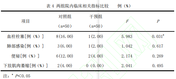 干预组血栓栓发生率显著低于对照组,具有统计学意义,见表4。