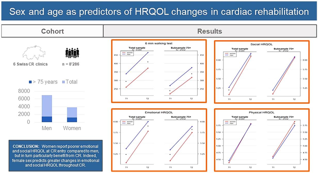 这项研究为心脏康复过程中性别和年龄相关的生活质量变化提供了重要的新证据。女性在康复入院时的情感和社会生活质量显著低于男性,但在康复过程中她们在所有生活质量领域的改善幅度最大。针对女性和老年患者的特定需求进行优化的康复项目是实现最佳预防效果的关键。