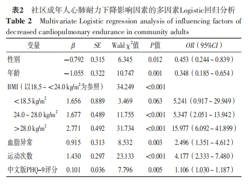 采用SPSS26.0统计学软件进行数据分析。不符合正态分布的计量资料以M(P25,P75)表示,组间比较采用非参数检验;计数资料以相对数表示,组间比较采用χ2检验;采用多因素Logistic回归分析探讨社区成年人心肺耐力下降的影响因素。以P<0.05为差异有统计学意义。