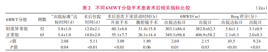 结果显示,术前6MWT评估轻度异常组与正常组患者的达到出院标准时间、术后住院时间、(开放手术患者)术后首次下床活动时间、术后6MWD及Borg评分比较,差异均存有统计学意义,耐力功能正常组各项指标更优(P>0.05),详见表2。