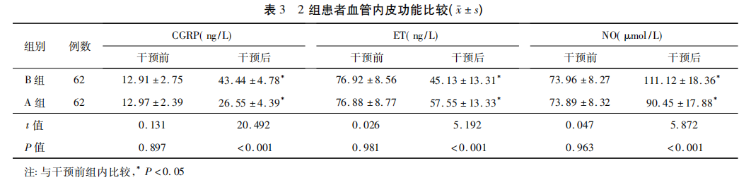 干预后2组CGRP、ET、NO水平较干预前显著改善,且B组各项指标改善程度优于A组,差异均有统计学意义(P<0.05),见表3。