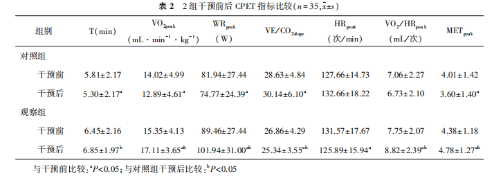干预后,观察组T、VO2peak、WRpeak、VO2/HRpeak和METpeak高于对照组,VE/CO2slope低于对照组(P<0.05)。干预后,对照组T、VO2peak、WRpeak和METpeak低于干预前,VE/CO2slope高于干预前(P<0.05);干预后,观察组VO2peak、WRpeak、VO2/HRpeak和METpeak高于干预前,VE/CO2slope和HRpeak低于干预前(P<0.05)。见表2。