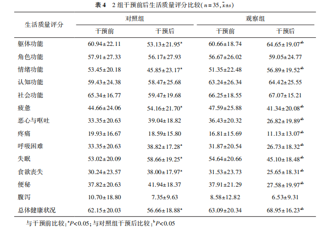 应用癌症患者普适性量表QLQ⁃C30评估2组患者干预前后的生活质量变化,好,症状领域分数越高说明生活质量越差。