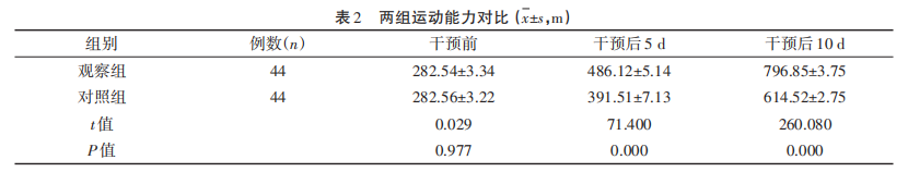 对比两组运动能力改善情况,干预前差异无统计学意义(P>0.05),干预后观察组运动能力强于对照组,差异有统计学意义(P<0.05),详见表2。