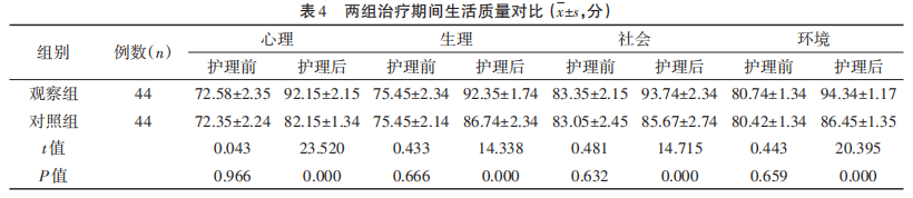 护理后GQOL-74量表评分,观察组高于对照组,差异有统计学意义(P<0.05),详见表4。