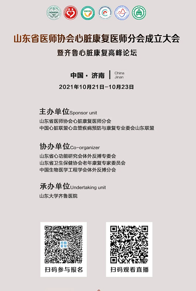 山东省医师协会心脏康复分会成立大会暨第三届齐鲁心脏康复高峰论坛、第三届山东省老年康复学术交流会议、第四届山东省体外反搏学术交流会议、老年心脏康复临床实践培训班将于 2021年10月21日—10月23日于线上和线下联合举办。会议期间举行CDQI国家标准化心脏康复中心建设单位授牌仪式。