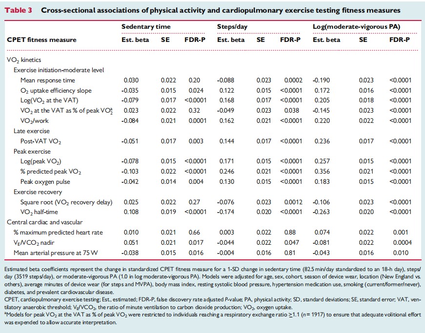 除了VO2peak外,我们还观察到PA与许多CPET指标之间的关联,这些指标反映了中等水平运动起始、持续、峰值运动和恢复期的VO2。虽然MVPA有望促进对高强度峰值运动(如VO2peak)的适应,但我们发现,相对于步数或SED,MVPA在整个运动过程中对反映CPET指标VO2的相对效应更大,这表明MVPA可能促进个体对所有强度运动水平的整体适应。