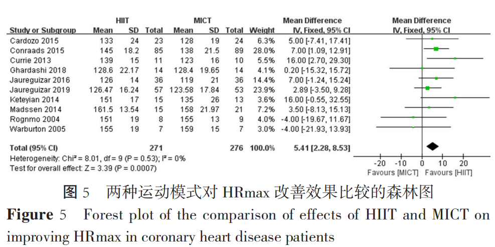 2.3.1.3 HRmax在纳入的12篇文献中,共有10篇文献报道了HRmax,经过异质性检验:I2=0,P=0.53,选择固定效应模型进行Meta分析,结果显示,HIIT对HRmax的改善效果优于MICT,差异有统计学意义〔MD=5.41,95%CI(2.28,8.53),P=0.0007〕,见图5。