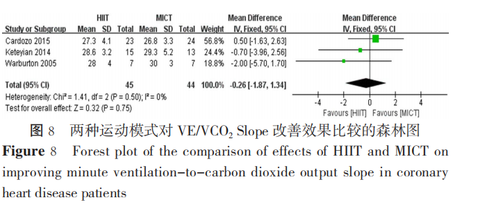 2.3.1.6 VE/VCO2Slope在纳入的12篇研究中,共有3篇研究报道了VE/VCO2Slope,经过异质性检验:I2=0,P=0.50,选择固定效应模型进行Meta分析,结果显示,两种运动模式对VE/VCO2Slope的改善效果比较,差异无统计学意义。〔MD=-0.26,95%CI(-1.87,1.34),P=0.75〕,见图8。