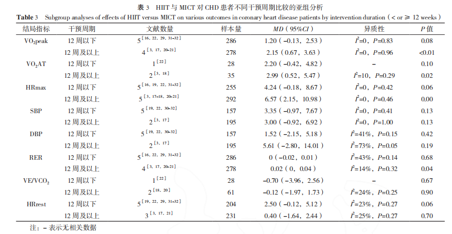 HIIT与MICT对CHD患者心肺功能的影响可能受干预周期的影响,因此本研究对不同干预周期进行亚组分析,亚组分析结果表明:对于干预周期在12周及以上的患者,HIIT对于VO2peak、RER、VO2AT和HRmax的改善效果优于MICT,差异有统计学意义(P<0.05);而干预周期在12周以下的患者,两种运动模式对于各指标的改善效果比较,差异无统计学意义(p>0.05),见表3。