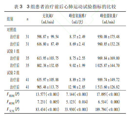 试验1组治疗后无氧阈较治疗前升高,且较对照组治疗后升高;试验2组治疗后无氧阈、峰值氧脉搏、峰值摄氧量较治疗前升高,且较对照组和试验1组治疗后均升高,见表3。