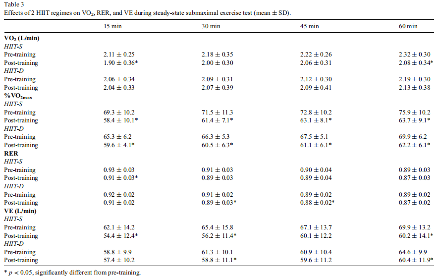 稳态亚极量运动测试和底物氧化:运动训练增加了两组受试者的VO2max,训练前后绝对运动负荷相同,两组训练前VO2max百分比降低(p<0.05;表3),组间无差异(HIIT-S:从72.4%降至61.7%,下降了10.7%;HIIT-D从训练前的67.2%降至60.8%,下降了6.4%;d=0.13)。在稳态亚极量运动测试中,HIIT-S组在15分钟时RER较低(d=0.01),HIIT-D 组在30分钟(d=0.33)和45分钟(d=0.28)时RER较低(p<0.05)。在HIIT-S组中,VE在15分钟(d=0.26)、30分钟(d=0.04)和60分钟(d=0.01)时显著降低,在HIIT-D组中,VE在30分钟(d=0.22)和60分钟(d=0.01)时显著降低(p<0.05),组间无差异(p>0.05)。HIIT-S组在训练后进行60分钟踏车,运动15分钟(d=0.57)和60分钟(d=0.35)绝对摄氧量显著降低(p<0.05),但hiit-d组无明显变化(p>0.05)。两组受试者训练后在稳态亚极量运动测试期间,15分钟(d=0.15)、30分钟(d=0.13)、45分钟(d=0.26)和60分钟(d=0.20)的VO2max相对百分比均显著降低(p<0.05),两组之间无明显差异(主效应,p>0.05;表3)。