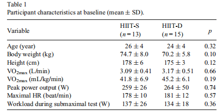 此项研究纳入28例从事娱乐活动,每周参加2~3次锻炼(如自行车、跑步、足球)的健康男性(年龄:25±4岁;身高:176.3±6.0cm;体重:72.7±8.1kg)。将受试者随机分配到两次高强度间歇训练组(HIIT-D)(n=15)或单次高强度间歇训练组(HIIT-S)(n=13)。纳入标准:男性,年龄20-30岁,积极参加娱乐活动,不吸烟,未参加任何包括耐力、短跑和抗阻在内的系统性训练。排除标准:已知存在运动受限的心血管疾病、呼吸或代谢性疾病,或正在服用明确影响代谢的药物或补充剂的患者。入组前受试者完成国际体力活动问卷。
