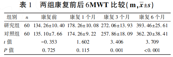①观察两组康复后6MWT,时间选择患者餐后2h进行,地点选择在病区走廊(两边有扶手),测量一段30m的距离并两端线条标注,让患者尽可能快地行走6min,对康复前、康复1、3、6个月的步行距离进行统计比较,步行距离越长表明心脏越能耐受步行的负荷,心功能越好。