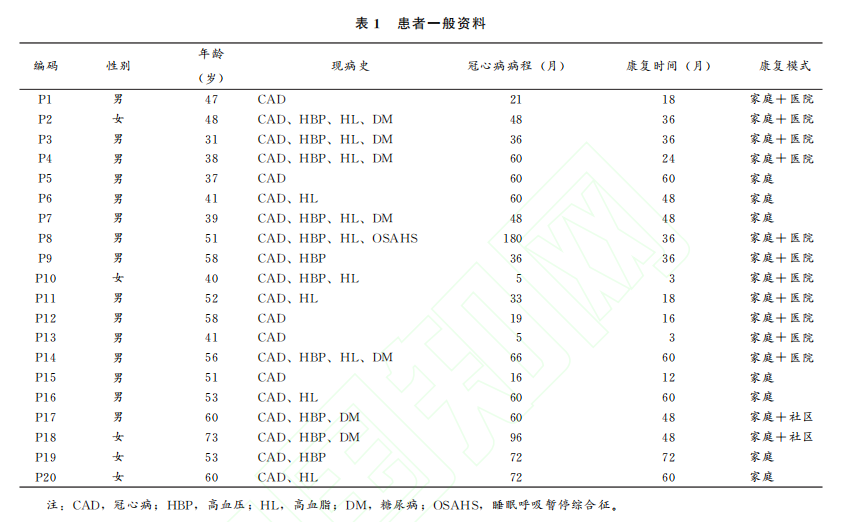 以信息饱和为原则,有效访谈20例患者(编码为P1~P20)和6例医务人员(编码为M1~M6)。患者包括7例纯家庭康复者,11例家庭和医院结合康复者,2例家庭和社区结合康复者;15例男性,5例女性;平均年龄(49.4±10.2)岁,病程5个月至15年,康复时间3个月至6年(表1)。医务人员包括三甲医院2名心血管专科医生,1名护士,1名治疗师,社区医院2名全科医生;平均年龄(39.7±9.4)岁,工作年