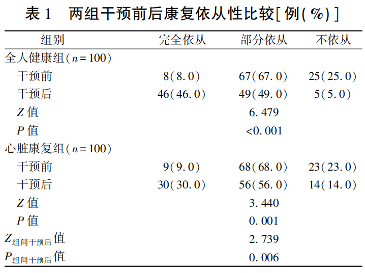 ①康复依从性比较:比较干预前后两组康复依从性,评估患者心脏康复训练配合情况,完全依从为充分配合心脏康复训练,部分依从为部分配合心脏康复训练,不依从为不配合心脏康复训练。