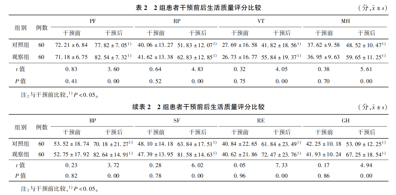干预后观察组SF⁃36量表各维度评分与对照组比较明显升高(P<0.05)。见表2。