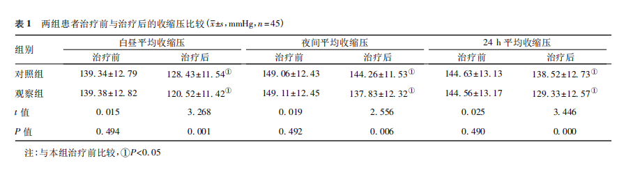 选取我院2020年1月~2021年5月收治的90例中青年高血压患者按照不同治疗方法对其分为对照组和观察组各45例。对照组中男26例,女19例;年龄45~58岁,平均(41.48±7.22)岁;病程1~8年,平均(4.23±2.16)年;高血压分级:Ⅰ级27例,Ⅱ级13例,Ⅲ级5例;文化水平:小学及以下5例,初中与高中25例,大学及以上15例。观察组中男25例,女20例;年龄46~59岁,平均(41.51±7.20)岁;病程1~8年,平均(4.25±2.14)年;高血压分级:Ⅰ级27例,Ⅱ级12例,Ⅲ级6例;文化水平:小学及以下6例,初中与高中24例,大学及以上15例。比较两组基本资料,差异无统计学意义(P>0.05)。本研究经过本院医学伦理委员会同意。