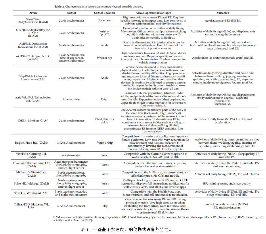 - 从可穿戴设备接收各种参数(例如,距离和步数)的信息对用户来说是激励性的,这可能有助于促进体力活动实践的依从性。此外,这可以激发行为改变,特别是由于提供即时反馈的机会。市场上有多种类型的可穿戴设备可用于测量体力活动,例如加速度计、计步器、心率监测器等。表1总结了一些商业可用的基于加速度计的可穿戴设备的特征。