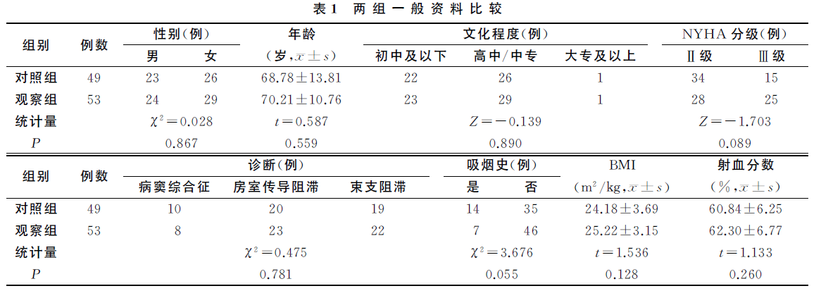 选取2021年3月至2022年3月在河南省某三级甲等医院行心脏起搏治疗患者为研究对象。纳入标准:①符合病态窦房结综合征、Ⅱ度Ⅱ型房室传导阻滞、Ⅲ度房室传导阻滞或束支阻滞的诊断;②符合三腔起搏器植入指征。排除标准:①存在严重沟通障碍;②纽约心脏病学会NYHA分级为Ⅳ级或合并恶性心律失常;③行动不便;④急性冠脉综合征后左室功能不全;⑤新发心绞痛。