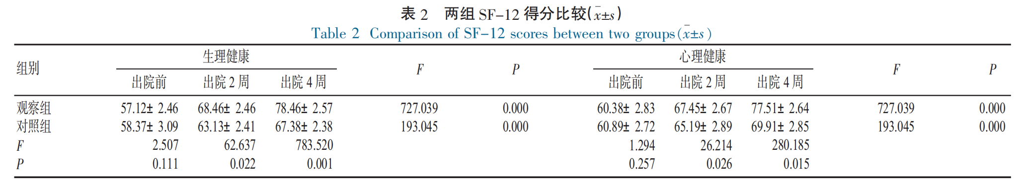 两组出院2、4周时,SF-12得分比较差异有统计学意义(P<0.05)。患者PCI术后以静卧为主,待生命体征平稳后可在床上主动活动。因此,要引导其树立早期运动观念,在保证安全的情况下,对运动强度和时间做出相应调整,保持平和的心态,树立战胜疾病的信心。术后早期在床上做适度主动运动训练,可促进血液循环,增加回心血量,改善呼吸功能,增加肺活量,提高患者适应能力。序贯式心脏康复运动训练让患者在可接受的范围内活动,有助于调节和改善各系统功能,提高肌肉、骨骼和心血管系统的适应性,进而提高患者生活质量。