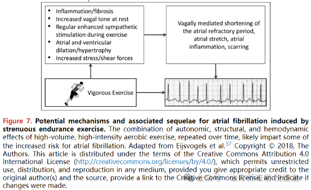 2020年,Circulation杂志发表了一篇题为“长期运动训练后与运动相关的急性心血管事件和潜在的有害适应性”研究,提出体力活动与房颤事件之间的U型关系,每周进行每小时5-20MET身体活动的个体患房颤的风险显著降低,每周进行每小时>55MET身体活动的个体患房颤的风险显著增高。剧烈体力活动导致心肌不良重塑,包括炎症和纤维化、静息状态下迷走神经张力增加、运动期间交感神经刺激增强、心房和心室膨胀/病理性肥大,其结局是增加房颤的风险。