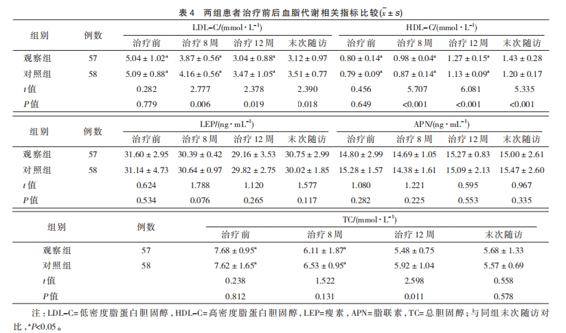 治疗前,两组患者LDL-C、HDL-C、LEP、APN和TC差异均无统计学意义(P>0.05)。治疗前后,两组LEP、APN无显著变化(P>0.05),差异无统计学意义(P>0.05)。治疗8周、12周,两组LDL-C、TC均降低,HDL-C升高,差异具有统计学意义(P<0.05)。观察组治疗8周、12周以及末次随访时,LDL-C均低于对照组(P<0.05),HDL-C均高于对照组(P<0.05)。治疗12周,观察组TC低于对照组(P<0.05),见表4。