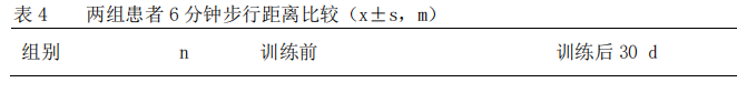 训练30天,观察组6分钟步行距离优于对照组,(P<0.05),见表4。