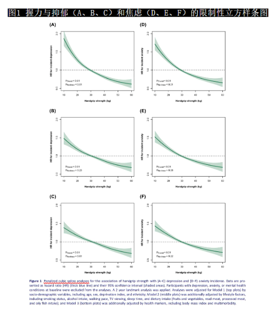 关于焦虑症状,目前的研究表明,较低的HGS与焦虑症的持续存在之间可能存在联系。然而,HGS与新发焦虑症之间的关系尚未得到充分研究和证实。在Carvalho等人的研究中,通过对爱尔兰老龄化纵向研究中的5271名受试者进行分析,他们并未发现肌力低下(男性HGS小于30kg,女性小于20kg)与焦虑症的发生有显著关联。Gordon等人在同一队列的3234名受试者中进行的研究则发现,HGS每增加1个标准差(SD),广泛性焦虑症的发生几率降低了24.2%。然而,本研究发现,与HGS位于最高三分位数的受试者相比,处于中间和最低三分位数的受试者发生焦虑症的风险分别增加了13%和27%。此外,补充分析还显示,肌力低下(男性HGS小于26kg,女性小于16kg)与焦虑症风险增加24%有关。Kandola等人的研究也发现,低和中等HGS与通过广泛性焦虑症自评量表报告的焦虑发生率分别增加了1.38和1.14倍。本研究结果支持了Kandola等人的发现,但本研究中使用的是来自医院和初级保健记录的更客观的数据,而非仅仅依赖于自我报告的抑郁症状。尽管如此,鉴于目前相关研究的数量仍然有限,未来仍需进一步探讨HGS对焦虑症发作的潜在保护作用。