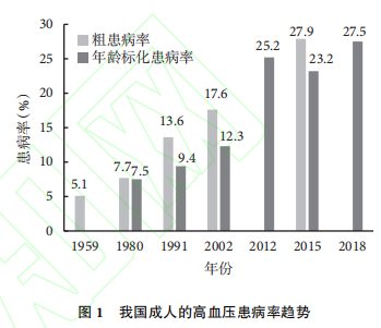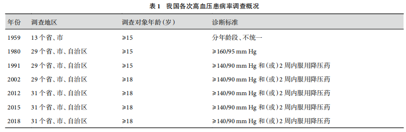 我国自 1958 年开始,开展了多次高血压患病率调查,但各次调查的高血压诊断标准、调查人群和调查地区不尽相同(表1)。诊断标准:1959年的调查对于高血压的诊断标准为舒张压>90mmHg(1mm Hg=0.133 kPa)和(或)39岁以下收缩压>140 mmHg,40 岁以上年龄每增加10岁收缩压的标准提高10mm Hg;1980年的调查对于高血压的诊断标准为收缩压≥160mm Hg和(或)舒张压≥95mmHg,但未考虑两周内服药情况;1991年、2002年、2015年、2018年的高血压诊断标准为收缩压≥140mm Hg 和(或)舒张压≥90mmHg,并考虑2周内的服药情况。调查人群:1959年、1980年、1991年为≥15岁的居民,2002年、2012年、2015、2018年为≥18岁的居民。调查地区:调查地区从1959年的13个省市增加到2015年的31个省、市、自治区。尽管诊断标准和调查人群有所差异, 但也可以大致看出,我国高血压的患病率总体呈现上升趋势(图1)。