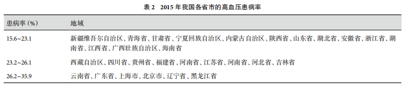 此外,2015年的高血压患病率调查公布了各省份的患病率信息,从总体上看,高血压患病率存在明显的地域特征,北京、天津、上海 3 个直辖市,以及东北黑龙江省和辽宁省、广东省的高血压患病率较高;总体而言,西部和中部的高血压患病率较低(表2)。之后,《中国居民营养与慢性病状况报告(2020年)》公布的数据显示,2015年的年龄标化患病率达27.5%,与中国高血压调查的结果相似。
