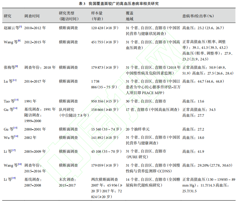 2017年,中国心脏大会发布“十二五”期间高血压抽样调查的最新数据:成人高血压患病率为23.0%,患病人数达2.435亿人;经过复杂加权后,随着年龄增长,高血压患病率呈上升趋势,男性患病率高于女性(24.3%比21.6%),然而,城市和农村之间的高血压患病率差异并不显著(23.1%比22.9%) 。2021 年《中华流行病学杂志》发表的《2018 年中国成年居民高血压患病与控制状况研究》一文报道了 2018 年“中国慢性病及其危险因素监测”对于31个省(自治区、直辖市)成人常住居民的调查结果,成人居民中,正常水平血压者占35.0%,女性高于男性(P<0.0001);成人居民中,高血压患病率为27.5%,男性的高血压患病率(30.8%)高于女性(24.2%),农村(29.4%)高于城市(25.7%),华北地区(33.3%)和东北地区(32.7%) 高于其他地区。近年我国覆盖面较广的高血压患病率相关研究简况见表3。