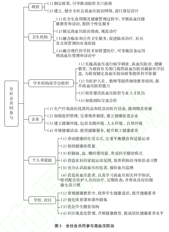 总之,《健康中国行动(2019–2030 年)》所提出的高血压防控相关目标的实现,有赖于政府、社会和个人的多措并举,全社会共同参与,从健康知识普及,危险因素干预,主动测量意识提升,首诊血压测量制度落实,政府、学校、企业、学术机构、媒体、个人等共同参与,在各个方面做出进一步的努力。