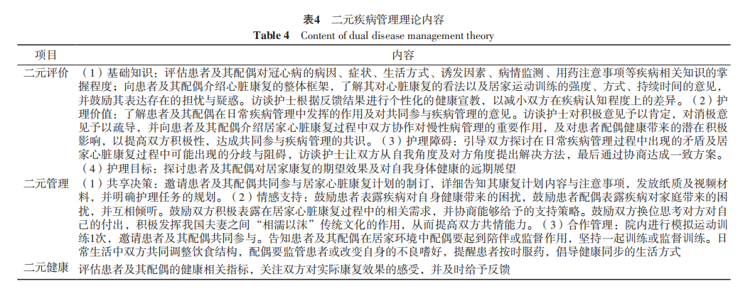 将二元疾病管理理论用于接受PCI的老年冠心病患者的居家心脏康复中,可有效增加其运动次数,提高其运动依从性、运动功能、自我管理行为及其配偶的健康促进行为水平。但本研究为单中心研究,样本量较小,未来仍有待通过大样本量、多中心研究进一步证实本研究结论。