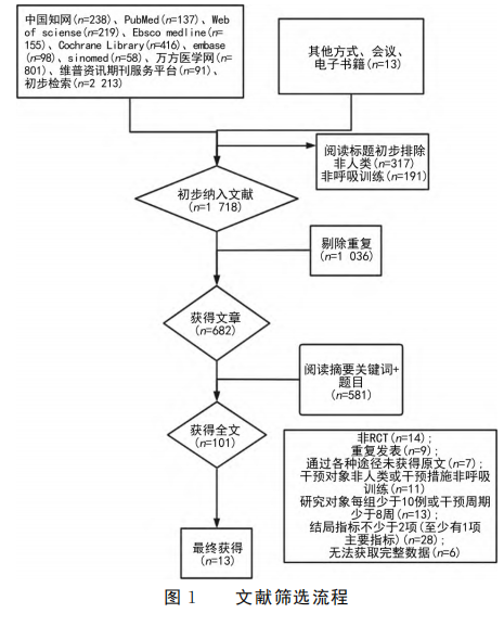 (7) 干预措施表述含糊或非呼吸训练;(8)研究患者每组少于10例或干预周期小于8周;