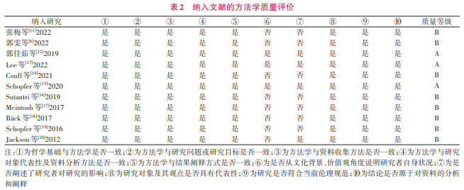 由2名研究者独立采用乔安娜布里格斯研究所(Joanna Briggs Institute,JBI)循证卫生保健中心质性研究质量评价标准(2016版)对纳入文献进行质量评价,对每个评价项目做出“是”“否”“不清楚”“不适用”的判断,并交叉核对结果。将文献进行3级质量评价:A级为完全符合质量标准;B级为部分符合质量标准;C级为完全不符合质量标准。评价若有异议,加入第3名研究者讨论,达成共识后解决。删除评级为C级的文献。