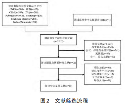 初步检索共获得相关文献3038篇,经逐层筛选,最终纳入11篇文献。文献筛选流程见图2。