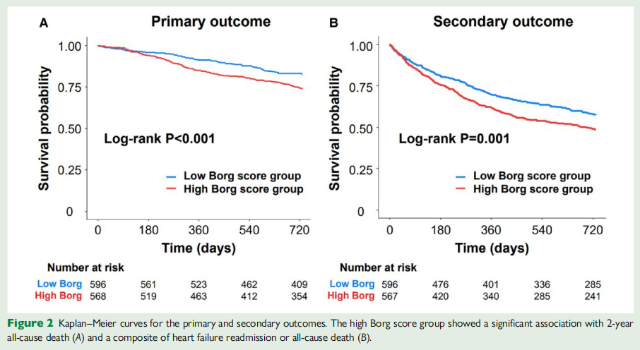 高Borg评分组的2年死亡率为24.5%,显著高于低评分组的16.1%。