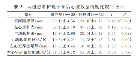 研究组患者室间隔肥厚、左心房扩大、主动脉扩张、主动脉粥样硬化水平均低于对照组(P<0.05)。在左心室后壁增厚和左心室舒张功能减退方面差异无统计学意义(P>0.05)。见表2。