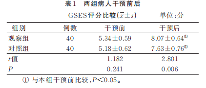 采用一般自我效能感量表(GSES)评估两组病人干预前、干预7d后自我效能。该量表包括“以我的才智,我定能应付意料之外的情况”及“我自信能有效应付任何突如其来的事情”等10个条目。各条目采用1~4分评分法,总分0~40分,得分越高表示病人自我效能越好。