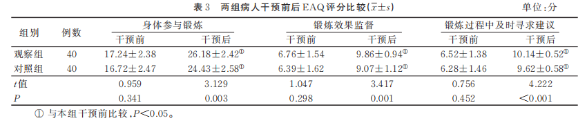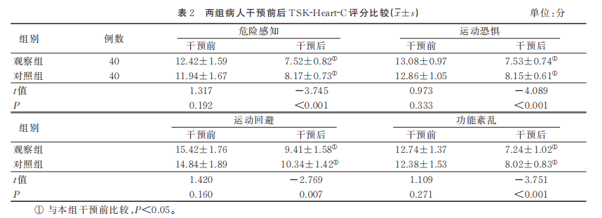 本研究发现,干预后观察组病人TSK-Heart-C评分较对照组低(P<0.05),EAQ评分较对照组高(P<0.05),说明将IARA干预用于PCI术后病人的护理中可减轻其运动恐惧,提高其运动依从性。分析原因:IARA干预通过定期开展会议,医疗团队可为病人详细解释手术后的康复计划、运动的重要性以及可能的好处,这种开放的沟通有助于消除病人对运动的不安和恐惧感,同时为病人提供表达疑虑及需求的平台。通过每次会议时检查其心脏康复运动有关知识掌握情况,强调其对康复计划的遵循,并通过康复医师的指导及心理医师的建议,纠正其运动可能引起心血管不良事件的认知,有助于病人理解术后运动对康复的重要性,使之了解遵守治疗计划有助于病人运动信心的建立,减轻其对运动的抵触情绪。通过向其介绍术后积极进行心脏康复运动恢复良好的病例,增强其对自身康复的责任感,激发其对自身健康的主动关注,有助于减轻运动恐惧,提高了运动依从性。