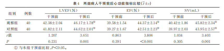 本研究发现,干预后观察组病人LVEF、EF、SV均较对照组高(P<0.05),说明将IARA干预用于PCI术后病人的护理中可提高其心功能。考虑是IARA干预通过每次开展会议时强调心脏康复运动的重要性,并使病人了解心脏康复运动对术后恢复的好处,鼓励其术后积极运动,不仅减轻其对运动的担忧及惧怕,还能提高其运动依从性,使之在康复医师的指导下术后积极开展心脏康复运动,坚定其运动信念;通过每次会议检查病人掌握心脏康复运动方法的情况,对未掌握的病人进行再次指导,耐心回复其疑虑,减少错误运动的可能性,进而促进其心功能的恢复。